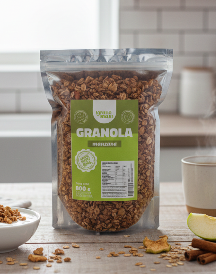 canela, manzana deshidratada, extracto de vainilla y vitamina E (antioxidante natural)